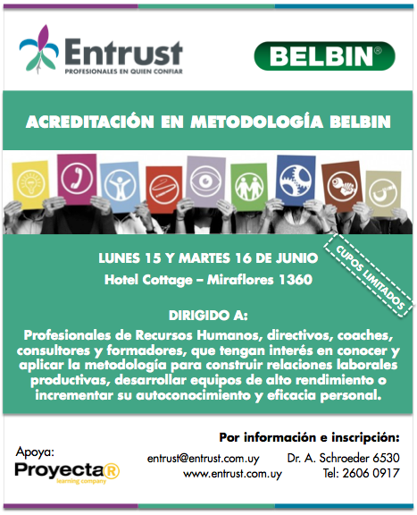 Los pasados 8 y 9 de Julio Entrust recibió la Acreditación en la reconocida Metodología Belbin en la ciudad de Mexico, DF. La Metodología Belbin se basa en la existencia de 9 Roles de equipo, necesarios para el óptimo funcionamiento de cualquier equipo de trabajo. La identificación y desarrollo de dichos roles permite lograr mejores resultados y un óptimo aprovechamiento de las diversidad. Se trata de una herramienta hoy aplicada en miles de organizaciones en el mundo, que mide el potencial de los individuos para comportarse en equipo, así como el potencial del mismo equipo para lograr un mejor desempeño. Se trata de un instrumento que ENTRUST se encuentra capitalizando para el trabajo en procesos de capacitación y desarrollo, coaching individual y grupal y procesos de selección internos y externos. Por más información contactar a Ana Inés Ruiz – aruiz@entrust.com.uy