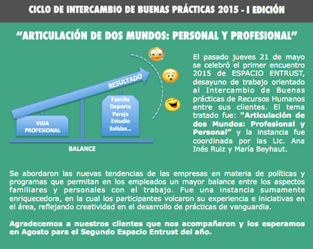 En la mañana del martes 20 de Mayo, se llevó en nuestras oficinas el primer Desayuno de Trabajo orientado a Intercambiar Buenas Prácticas de Gestión de Recursos Humanos. Contamos con profesionales de RRHH de empresas de primer nivel, tales como Supermercados TATA, Zonamerica, Punta Carretas Shopping, Bonprole, L´oreal, Merck Serono, E – Lace y Buxis, ente otros. El tema tratado fue respecto a Retención de Talentos: "Lo que te desmotiva me motiva" y fue facilitado por Lic. Ana Miguel (Responsable de Desarrollo Organizacional) y Lic. Ana Inés Ruiz (Directora de Entrust). El Ciclo 2014 de Espacio Entrust consiste de tres encuentros de intercambio de buenas prácticas a lo largo del año, con invitación a clientes y colegas de RRHH, de cupos reducidos y sin costo. |
